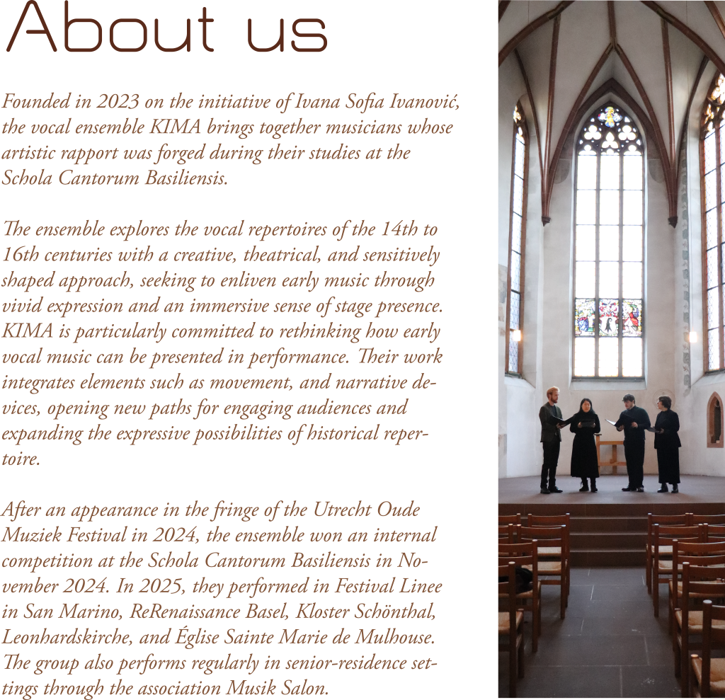 From medieval song to contemporary vocal creation, animals have always spoken for us. Foolish Men and Refined Beasts traces this powerful lineage, weaving together Trecento polyphony, Renaissance spirituality, and 20th century and contemporary works in a strikingly coherent musical journey.